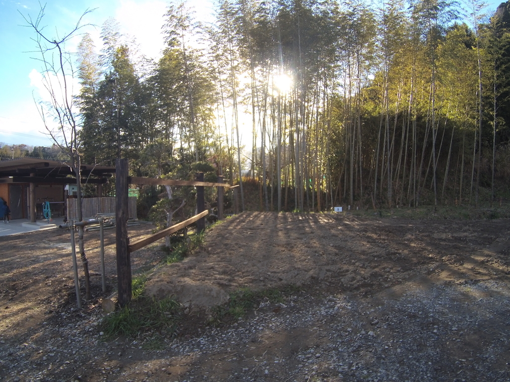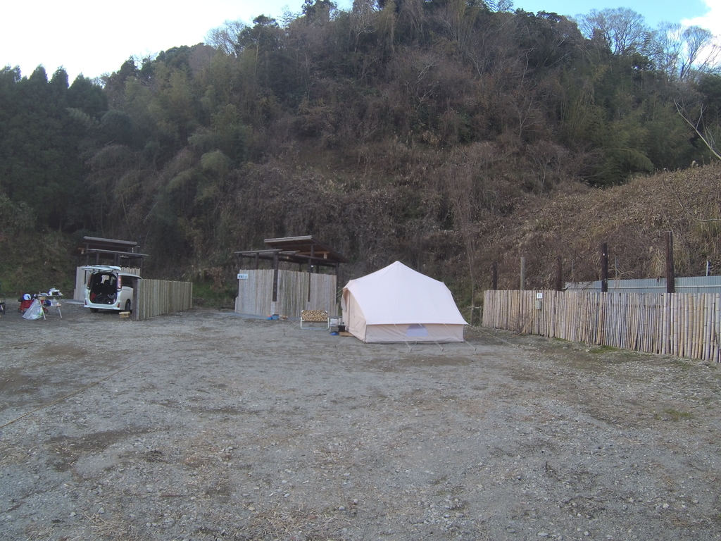 サリーちゃんファミリーは2泊だったので、既に設営済みです!私たちが着いた時にはお出かけ中でした。今回、私たちは露天風呂付サイトの予約ができなかった(2サイトしかない)のですが、サリーちゃんたちはその露天風呂付サイトだったのです。奥に見えるのが露天風呂。