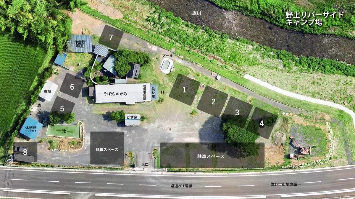 手打ちそばの旗が目立っていますが、こちらがキャンプ場です。